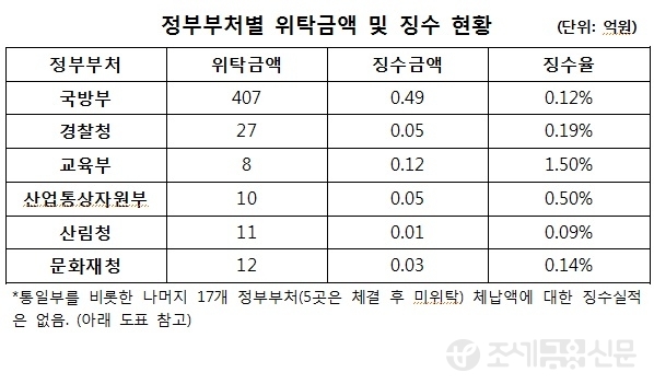 캠코가 위탁받은 23개의 정부부처별 체납액을 살펴보면 징수실적이 있는 곳은 6군데로 징수금액 및 징수율이 상당히 저조한 상태인 것으로 드러났다.