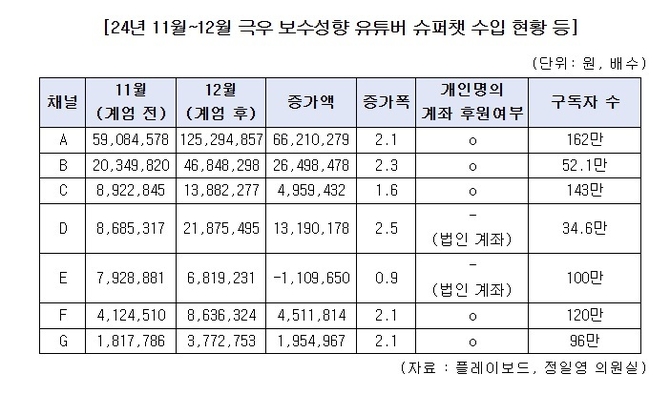 정일영 의원에 따르면 작년 11월 기준 극우·보수성향 유튜버 슈퍼챗 수입 순위 상위 7개 채널 중 6개 채널에서 12.3 비상계엄이 발생한 12월의 슈퍼챗 수익이 전월과 비교해 평균 2.1배 늘어났다.