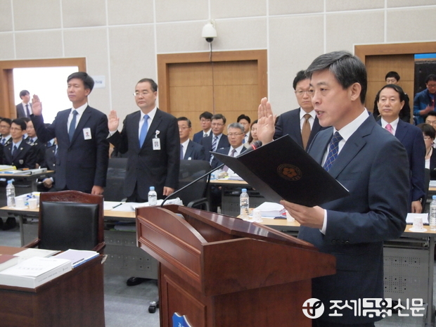 (조세금융신문=김태효 기자) 원정희 부산지방국세청장이 22일 부산경남본부세관에서 열린 국회 기획재정위원회의 부산지방국세청·부산경남본부세관에 대한 국정감사에서 증인 대표로 선서를 하고 있다.