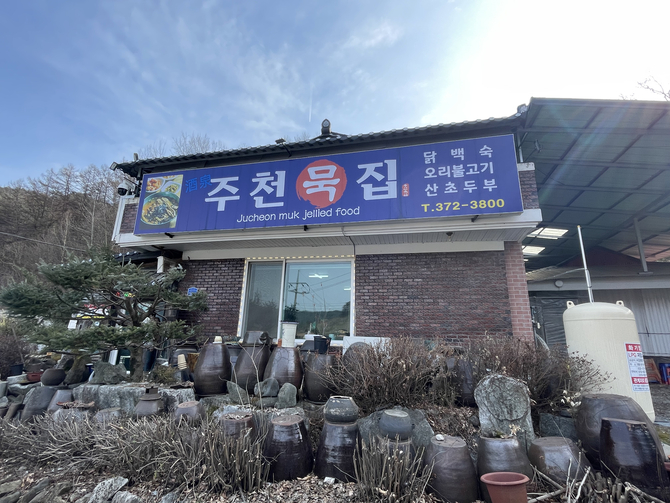 메밀꽃처럼 눈이 소복이 쌓인 겨울날 아침도 거른 채 처음으로 찾은 곳은 영월 주천면에 있는 ‘주천묵집’, 시내에서 조금 벗어난 시골 마을에 자리한 이곳은 소박한 풍경과 어우러져 더욱 정겹게 느껴진다.