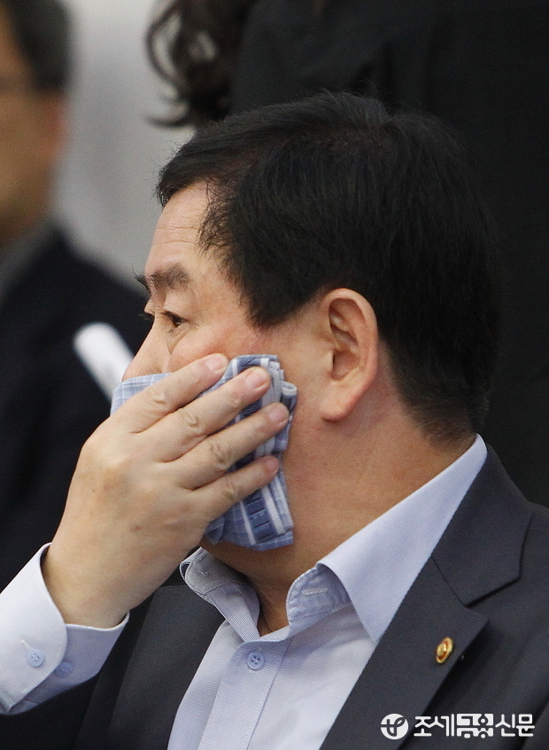 (조세금융신문=전한성 기자) '제18차 경제관계장관회의'가 22일 오후 서울 종로구 세종로 정부서울청사에서 열린 가운데 최경환 경제부총리 겸 기획재정부 장관이 땀을 닦고 있다.
