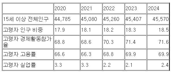 노동부는 "전반적인 고령자 고용 규모는 증가하는 추세지만, 베이비붐세대(1955∼1963년생)가 본격적으로 은퇴하면서 경제활동인구 부족이 우려된다"며 "양질의 고령자 일자리가 부족하고 임시·일용근로자 비중이 커 적극적인 취업 알선과 취업 지도의 중요성도 커지고 있다"고 해석했다.