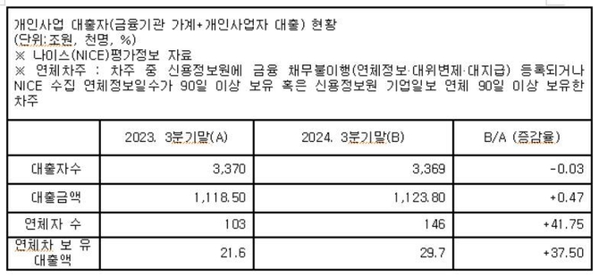 특히 연체(3개월 이상 연체 기준)가 발생한 상환 위험 차주(대출자)도 모두 14만6천명에 이르렀다. 2023년 3분기(10만3천명)와 비교해 1년 동안 41.8%나 급증했다.