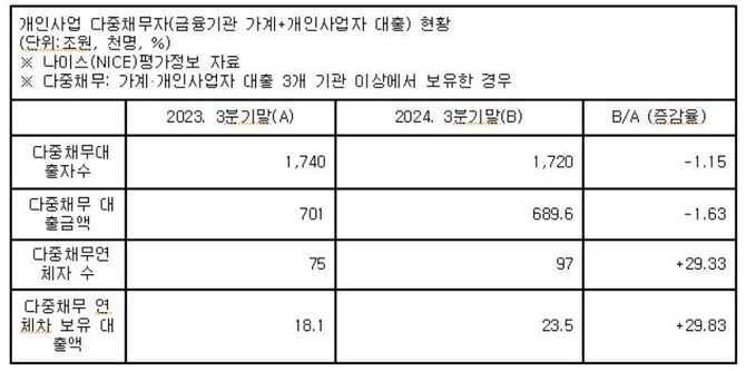 다중채무자는 가계대출 기관 수와 개인사업자대출 상품 수의 합이 3개 이상인 차주, 연체는 1개월 이상 원리금 연체(단 상호금융·저축은행은 1일 이상 원금 또는 1개월 이상 이자 연체)를 기준으로 정의됐다.