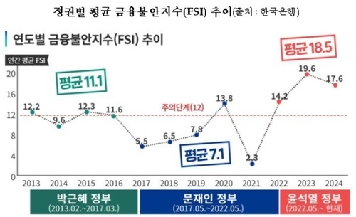 한은은 금융불안지수 12 이상을 '주의단계', 24 이상을 '위험단계'로 각각 분류하는데, 현 수준은 주의단계에 해당한다.