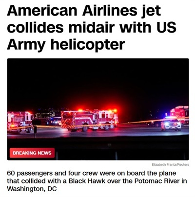 CNN 등 미 언론들은 29일(현지시간) 밤 아메리칸항공 산하 PSA가 운영하는 여객기가 미군 블랙호크 헬리콥터와 공중에서 부딪힌 뒤에 워싱턴의 로널드 레이건 공항 인근 포토맥강에 추락했다고 보도했다.