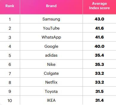 삼성전자에 이어 유튜브와 왓츠앱이 나란히 41.6점을 받아 2∼3위에 랭크됐고, 구글(40.0점)과 아디다스(35.4점), 나이키(35.3점), 구강관리 브랜드 콜게이트(33.2점), 넷플릭스(33.2점), 도요타(31.5점), 이케아(31.4점) 등이 상위 10위권에 포함됐다. 상위 10곳 중 아시아 기업은 삼성전자와 도요타 등 2곳이다.