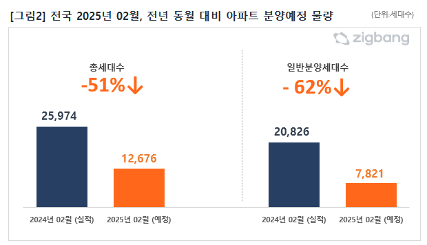 3일 직방에 따르면 2월 분양예정 물량은 16개 단지, 총 1만2676세대(일반분양 7821세대)로 조사됐다. 전년 동기간(2024년 2월 2만5974세대)과 비교해 51% 적은 물량이다.