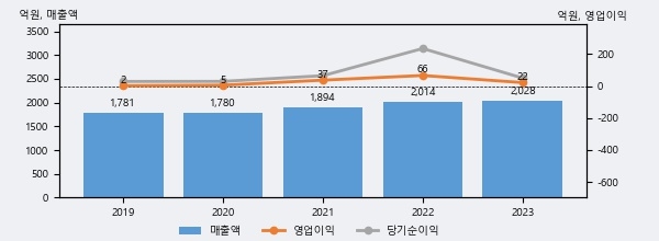 신영와코루의 2023년 매출액은 2028억으로 전년대비 0.7% 상승했고, 영업이익은 22억으로 전년대비 -67.3% 하락했다. 이 회사의 매출액 증감률과 영업이익 증감률은 각각 코스피 상위 50%, 하위 19%에 해당된다.