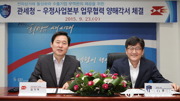 (조세금융신문=전한성 기자) '관세청-우정사업본부 업무협력 체결식'이 23일 오전 서울 강남구 언주로 서울본부세관에서 열린 가운데 이돈현(오른쪽) 관세청 차장과 김기덕 우정사업본부장이 기념촬영을 하고 있다.