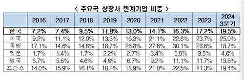 한국의 한계기업 비중은 미국(25.0%)에 이어 두 번째로 높았고 프랑스(19.4%), 독일(18.7%), 영국(13.6%), 일본(4.0%) 순이었다.
