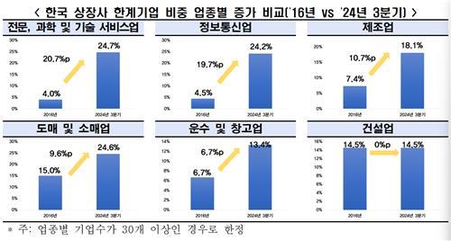 국내 업종별로 살펴보면 부동산업(33.3%), 전문·과학·기술 서비스업(24.7%), 도매·소매업(24.6%), 정보통신업(24.2%) 순으로 한계기업 비중이 높게 나타났다.
