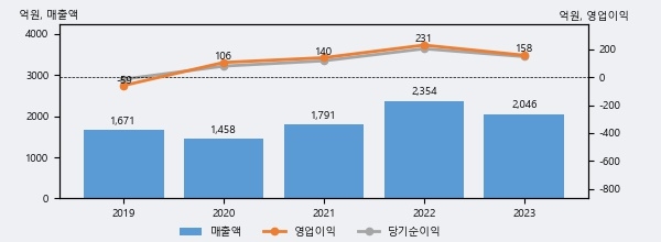 와이엠씨는 2023년 매출액 2046억원과 영업이익 158억원을 기록했다. 전년대비 매출은 -13.1%, 영업이익은 -31.7% 각각 하락했다. 이 회사의 매출액 증감률과 영업이익 증감률은 각각 코스닥 하위 30%, 하위 42%에 해당된다.