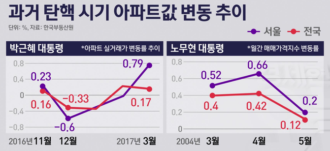 기자: 과거 유사한 탄핵 사태가 있었던 때에는 부동산 가격이 어땠을지 궁금합니다. 2004년 노무현 전대통령 탄핵과, 2016년 박근혜 전대통령 탄핵 가결시 전국 부동산 가격말입니다.