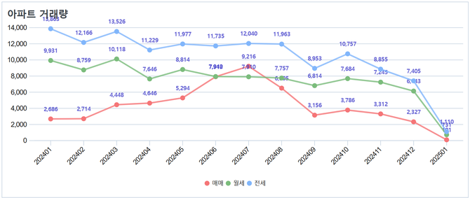 서울동산정보광장(2025.01.10.) 자료를 보면 지난해 7월 매매는 7,910건이었으며 대출을 규제하던 9월은 3,156건, 탄핵이 시작된 12월은 2,327. 그리고 금년 1월 10일까지 101건 거래가 되었습니다. 물론 거래가 성사되고 30일 이내 신고하는 점을 감안하면 거래량은 한달전 거래량으로 보면 될 것입니다.
