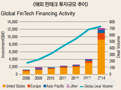 그리고 드디어 ‘알리바바’가 주식시장 상장한 첫날, 시가총액이 2,300억 달러를 돌파하며 ‘알리바바’는 ‘구글’에 이은 글로벌 제 2대 인터넷 기업으로 단숨에 올라섰다. 핀테크에 대한 전 세계 투자규모 또한 2013년 4조원에서 2014년 12조원 규모로 1년 사이 3배 이상 성장했다. 투자분야 또한 지급결제 분야 뿐만 아니라 금융 소프트웨어, 금융데이터 분석, 플랫폼 비즈니스 등 다양하다.