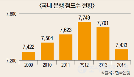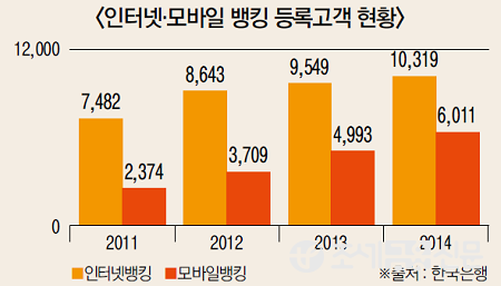 시간과 장소에 구애받지 않고 금융거래를 할 수 있는 비대면 채널 고객수는 점차 늘어나는 현상을 바탕으로 고객 니즈에 따라 전략을 바꾼 결과다. 일례로 국내 은행 점포수는 지난 2013년 7,701개에서 2014년 7,433개로 줄었다. 이는 2009년 점포수와 비슷한 수준이다. 반면 인터넷·모바일 뱅킹 등록고객수는 꾸준히 상승하고 있다.