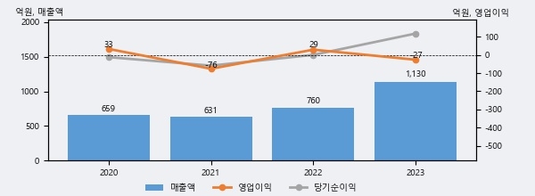 최근 실적을 살펴보면 2023년 매출액이 최근 4년 중 가장 높은 실적을 기록했음을 알 수 있다. 이전 최고 실적이었던 2022년 보다도 48.8%(370억 4천만원) 늘어난 것으로 나타났다.