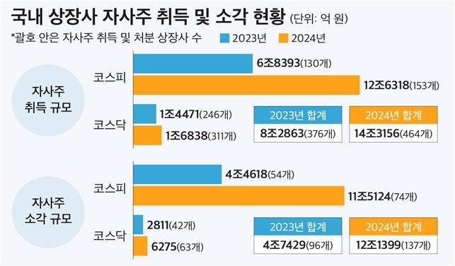 12일 기업데이터연구소 CEO스코어에 따르면 2023∼2024년 자기주식 취득 및 처분, 소각, 체결 공시를 제출한 국내 상장사를 조사한 결과, 지난해 상장사의 자사주 취득 규모는 14조3천156억원으로 집계, 2023년(8조2천863억원) 대비 72.8% 증가한 수치를 나타냈다.