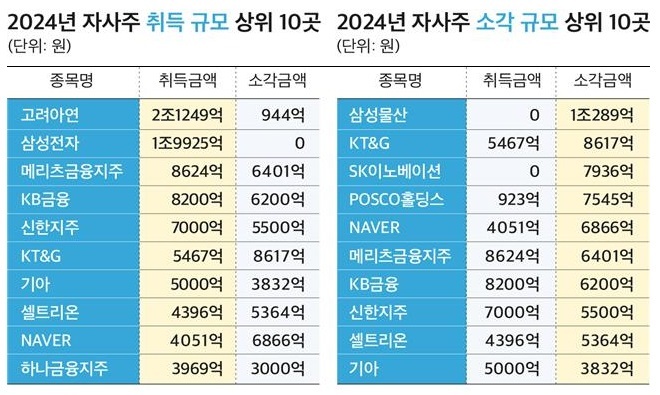 상장사 중 지난해 가장 많은 자사주를 취득한 기업은 고려아연(2조1천249억원)으로 조사됐는데, 영풍과의 경영권 분쟁에서 우위를 점하기 위해 자사주 공개 매수 전략을 발표하고, 발행주식 9.85% 수준의 자사주를 매입한 바 있다.
