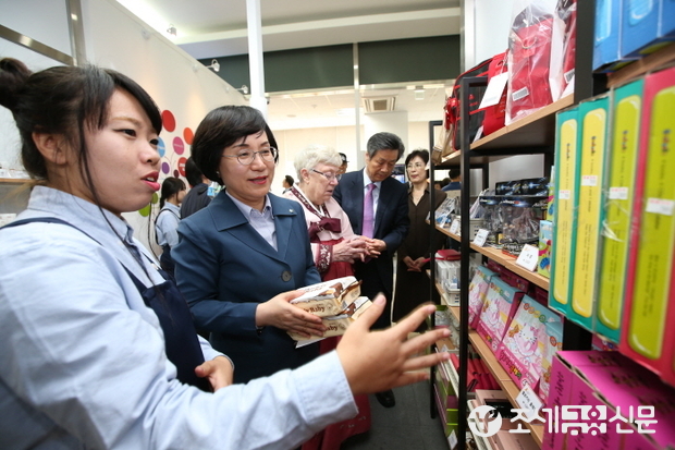 (조세금융신문=김사선 기자) 24일 서울 마포구 합정동에서 열린 캥거루스토어 2호점 개점식에 참석한 권선주 기업은행장이 매장을 둘러보고 있다. 캥거루스토어는 미혼모를 채용해 기업에서 후원받은 육아, 여성용품 등을 판매하고, 수익금으로 미혼모를 지원하는 선순환 구조의 공익형 매장이다. 캥거루스토어 1호점은 지난 5월 경기 수원시 우만동에서 개점한 바 있다. 사진제공=기업은행