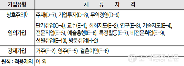 문화 예술(D-1), 유학(D-2), 산업연수(D-3), 일반연수(D-4), 종교(D-6), 방문동거(F-1), 동반(F-3), 기타(G-1)