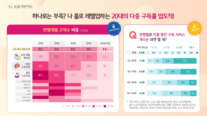 설문 참여 고객의 67%가 영상 스트리밍 서비스를 이용하고 있다고 답했다. 쇼핑·배달 멤버십 구독 응답자는 전체의 61%로 나타났다. 특히, 25세~29세 고객은 평균 7.3개 구독 서비스를 이용하고 43%는 7개 이상 이용 중이라고 응답해 다중 구독률이 높았다.