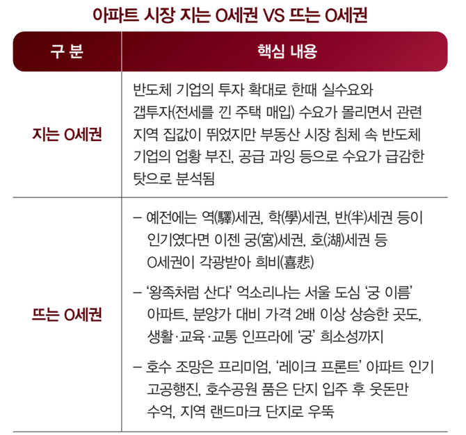 먼저 지는 O세권에 대한 소개다. 한동안 높은 인기를 끌었던 ‘반세권’(반도체+역세권) 일대 집값이 맥을 못 추고 있다는 소식이 들린다. 반도체 기업의 투자 확대로 한때 실수요와 갭투자(전세를 낀 주택 매입) 수요가 몰리면서 관련 지역 집값이 뛰었지만 부동산 시장 침체 속 반도체 기업의 업황 부진, 공급 과잉 등으로 수요가 급감한 탓이다.