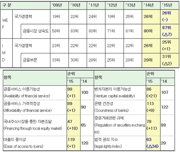 세계경제포럼(WEF)이 30일 발표한 ‘2015년 국가경쟁력 평가’ 자료에 따르면 올해 우리나라 금융시장 성숙도 순위가 지난해보다 7단계 하락한 87위를 기록했다.