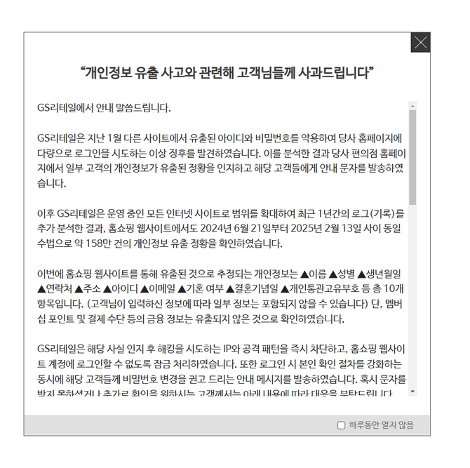 27일 GS리테일은 “2024년 6월 21일부터 올해 2월 13일 사이 GS홈쇼핑 웹사이트에서 개인정보 유출 정황을 확인했다”며 “해당 고객들에게 오늘 통지문을 발송했다”고 공지했다.