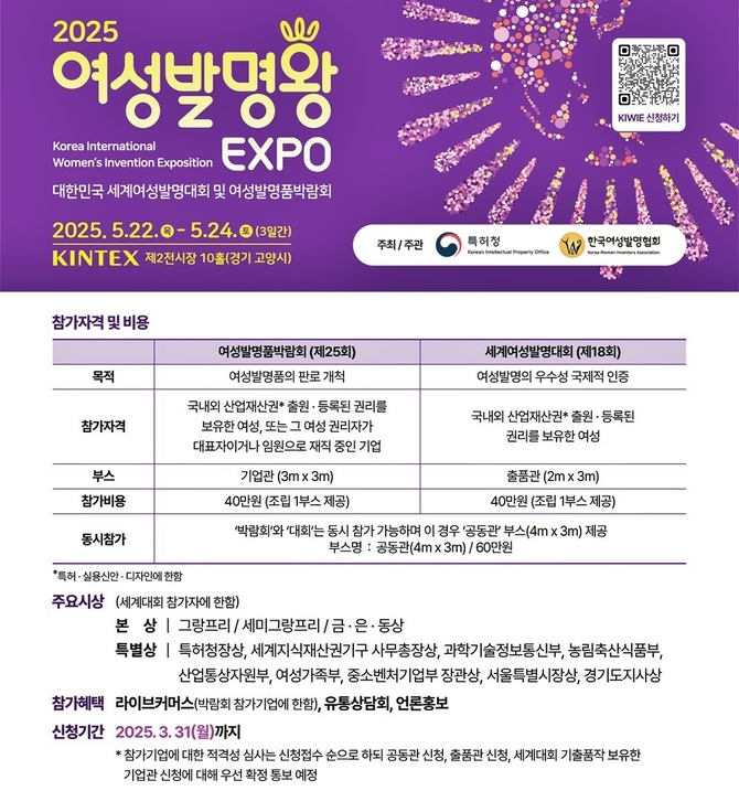 (조세금융신문=구재회 기자) 특허청과 한국여성발명협회는 오는 5월 22∼24일 경기도 고양시 킨텍스 제2전시장에서 열리는 '2025 여성발명왕엑스포'에 참가할 여성을 내달 31일까지 모집한다고 3일 밝혔다.