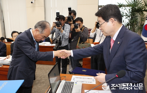 (조세금융신문=전한성 기자) 한국수출입은행·한국조폐공사에 대한 국회 기획재정위원회의 국정감사가 1일 서울 여의도 국회에서 열린 가운데 이덕훈(왼쪽) 수출입은행장이 정희수 위원장과 악수 나누고 있다.