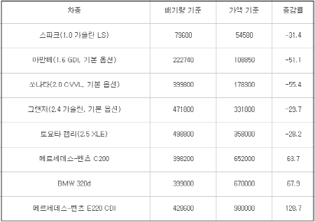 개정안을 적용하면 자동차세가 쏘나타는 17만8300원으로 현행보다 55.4% 낮아지고 메르세데스-벤츠 C200는 65만2000원으로 63.7% 높아진다. 경차인 한국지엠 쉐보레 스파크(1.0 가솔린 LS 기준)는 7만9600원에서 5만4580원으로 31.4% 낮아진다.