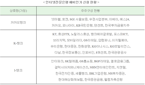 카카오컨소시엄은 카카오와 한국투자금융지주 등 11개 사가 주주로 참여했고 K-뱅크에는 KT와 우리은행 등 20개사가, I-뱅크에는 인터파크와 SK텔레콤 등 15개 업체가 참여했다.