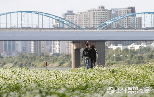(조세금융신문=전한성 기자) '2015 한강 서래섬 메밀꽃 축제'를 하루 앞둔 2일 오후 한 연인들이 서래섬의 메밀꽃밭을 산책하고 있다.