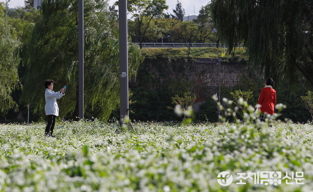 (조세금융신문=전한성 기자) '2015 한강 서래섬 메밀꽃 축제'를 하루 앞둔 2일 오후 시민들이 서래섬의 메밀꽃밭을 배경으로 기념촬영을 하고 있다.