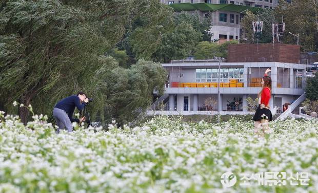 (조세금융신문=전한성 기자) '2015 한강 서래섬 메밀꽃 축제'를 하루 앞둔 2일 오후 한 연인들이 서래섬의 메밀꽃밭을 배경으로 기념촬영을 하고 있다.