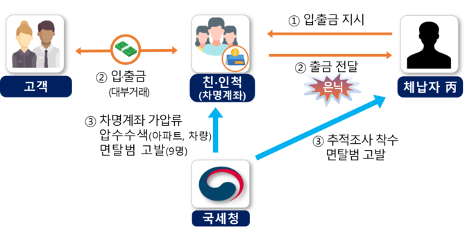 국세청은 배우자 금융계좌를 정밀추적하고, 이와 연계된 친·인척 명의의 금융계좌로 추적조사를 확대한 결과 이들 계좌로 불법대부업 자금이 움직이는 것을 포착했다.