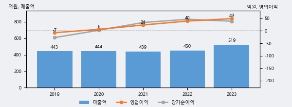 최근 실적을 살펴보면 2023년 매출액이 최근 5년 중 가장 높은 실적을 기록했음을 알 수 있다. 이전 최고 실적이었던 2022년 보다도 15.6%(69억 9천만원) 늘어난 것으로 나타났다.