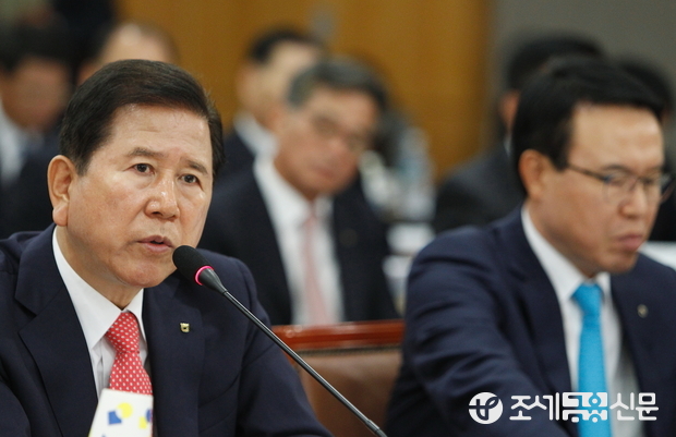 (조세금융신문=전한성 기자) 농협중앙회·농협금융지주·NH개발·농협자산관리·농협정보시스템·농협생명보험·농협손해보험·NH투자증권·NH-CA자산운용·농협캐피탈·NH선물·NH저축은행에 대한 국회 농림축산식품부해양수산위원회의 국정감사가 6일 서울 중구 새문안로 농협중앙회에서 열린 가운데 최원병 농협중앙회장이 의원들의 질의에 답변하고 있다.