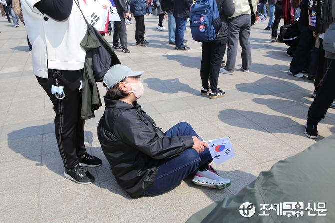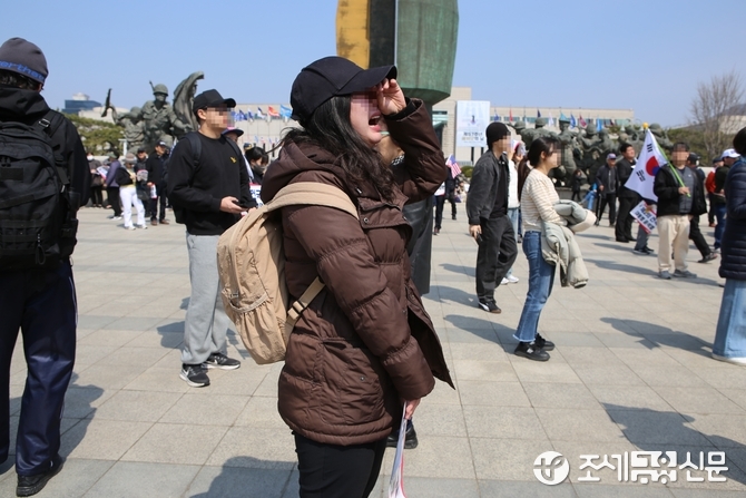 대통령실 인근 전쟁기념관 광장에 모인 탄핵 반대 단체인 ‘대통령국민변호인단’ 중 일부 시민이 눈물을 흘리고 있다.