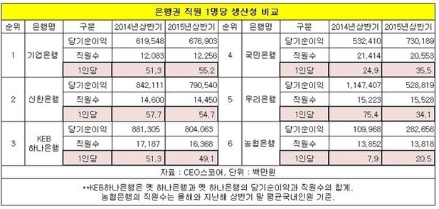 (조세금융신문=양학섭 기자)2015년 상반기 국내 주요 은행 중 직원 1인당 당기순이익이 가장 많은 곳은 기업은행이며 가장 적은 곳은 농협은행인 것으로 나타났다.