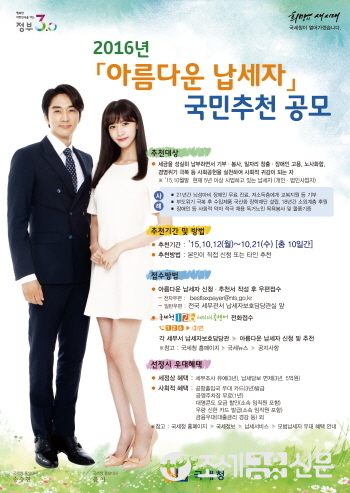 아름다운 납세자는 올해 10월 31일 기준으로 5년 이상 사업을 운영하고 있는 개인 또는 법인으로서 기부·봉사 등 사회공헌을 실천하거나 장애인 등 고용창출, 투명경영으로 건실한 기업 운영 등을 통해 지속적으로 사회와 국가발전에 기여하고 있는 납세자와 경제적 위기를 슬기롭게 극복하고 재기에 성공한 경우라면 추천 가능하다.
