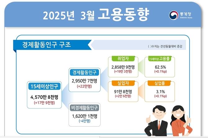 통계청은 8일, '2025년 3월 고용동향'을 발표하고 이같은 사실을 전했다. 이에 따르면 3월 취업자 수는 총 2858만 9000명으로 전년 동월 대비 19만 3000명 증가했다. 15세 이상 고용률은 62.5%로 전년대비 0.1%p 상승한 것으로 3월 기준 역대 최고다. 경제활동 참가율 역시 3월 기준 역대 최고인 64.6%로 전년대비 0.3%p 상승했다.