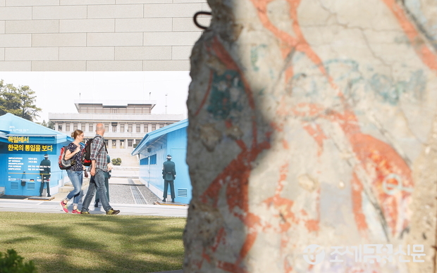 (조세금융신문=전한성 기자) 14일 오후 독일·한국 교류 특별전 ‘독일에서 한국의 통일을 보다’가 열리고 있는 서울 종로구 대한민국역사박물관 전시장 앞에 설치된 실제 베를린 장벽뒤로 판문점 사진이 보이고 있다. 이번 전시회는 12월 13일까지 개최된다.