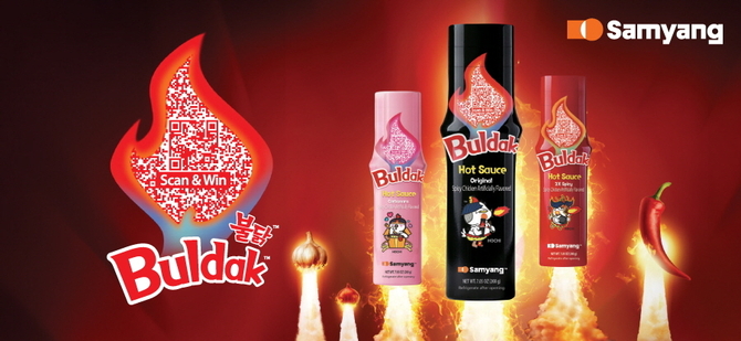 불꽃 그래픽으로 매운맛을 시각적으로 강조했고 소비자가 불닭소스 관련 콘텐츠에 쉽게 접근할 수 있도록 QR 코드를 넣었다.