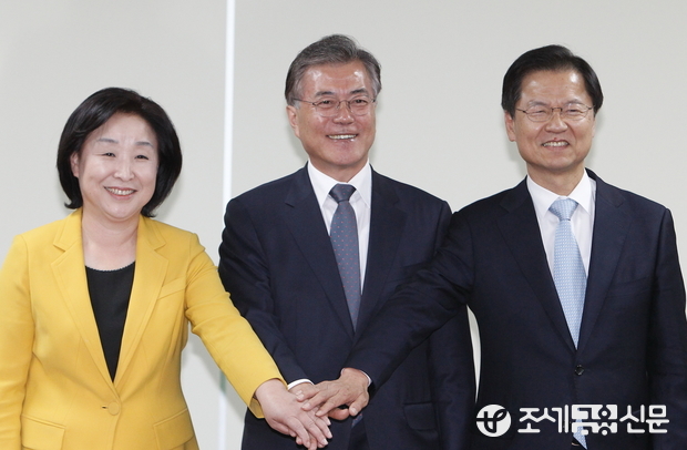 (조세금융신문=전한성 기자) 새정치민주연합 문재인 대표(가운데)와 정의당 심상정(왼쪽) 대표, 무소속 천정배 의원이 19일 오후 서울 여의도 국회 의원회관에서 열린 교과서 국정화 저지를 위한 3자 연석회의에서 손을 맞잡고 있다.