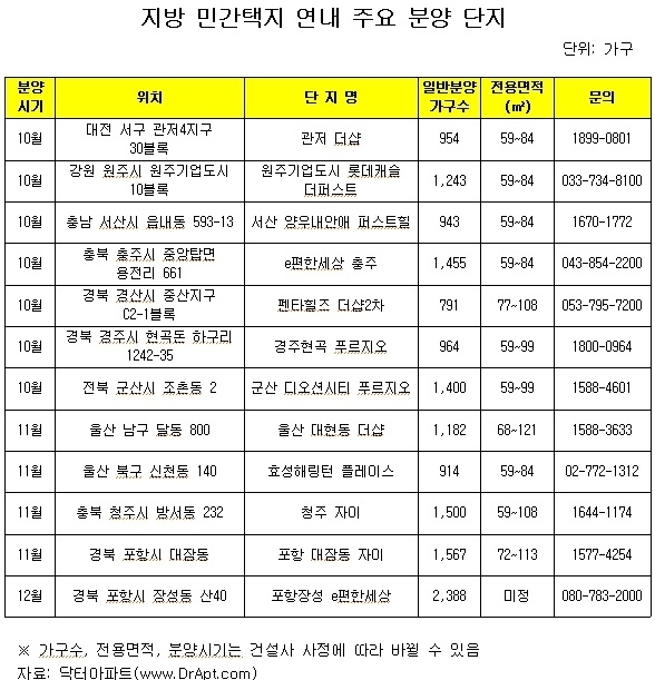 부동산 포털 닥터아파트(www.DrApt.com)에 따르면 2015년 10~12월 지방에서 100% 일반분양하는 민간택지 아파트는 37곳, 28,929가구( 재개발 재건축및 지역주택조합 아파트 제외)로 조사됐다.