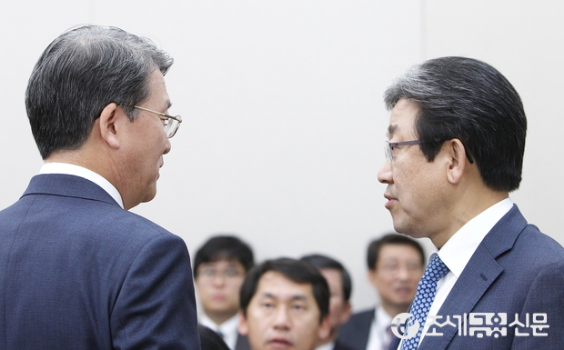(조세금융신문=전한성 기자) 국회 기획재정위원회의 전체회의가 20일 오전 서울 여의도 국회에서 열린 가운데 임환수(왼쪽) 국세청장이 김봉래 차장과 대화 나누고 있다.