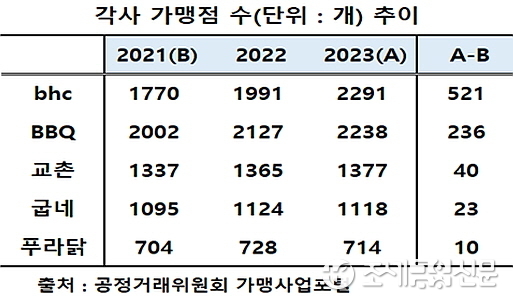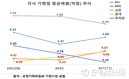 반면에 푸라닭 치킨의 경우 이들 중 유일하게 가맹점 평균매출이 매년 하락세를 지속한데다, 특히 2021년 5.36억 원에서 2023년 4.16억 원을 기록, 불과 2년 새 가맹점 평균매출이 1.21억 원이나 급감(감소율 22.5%)하는 가장 저조한 성적표를 만들어냈다.